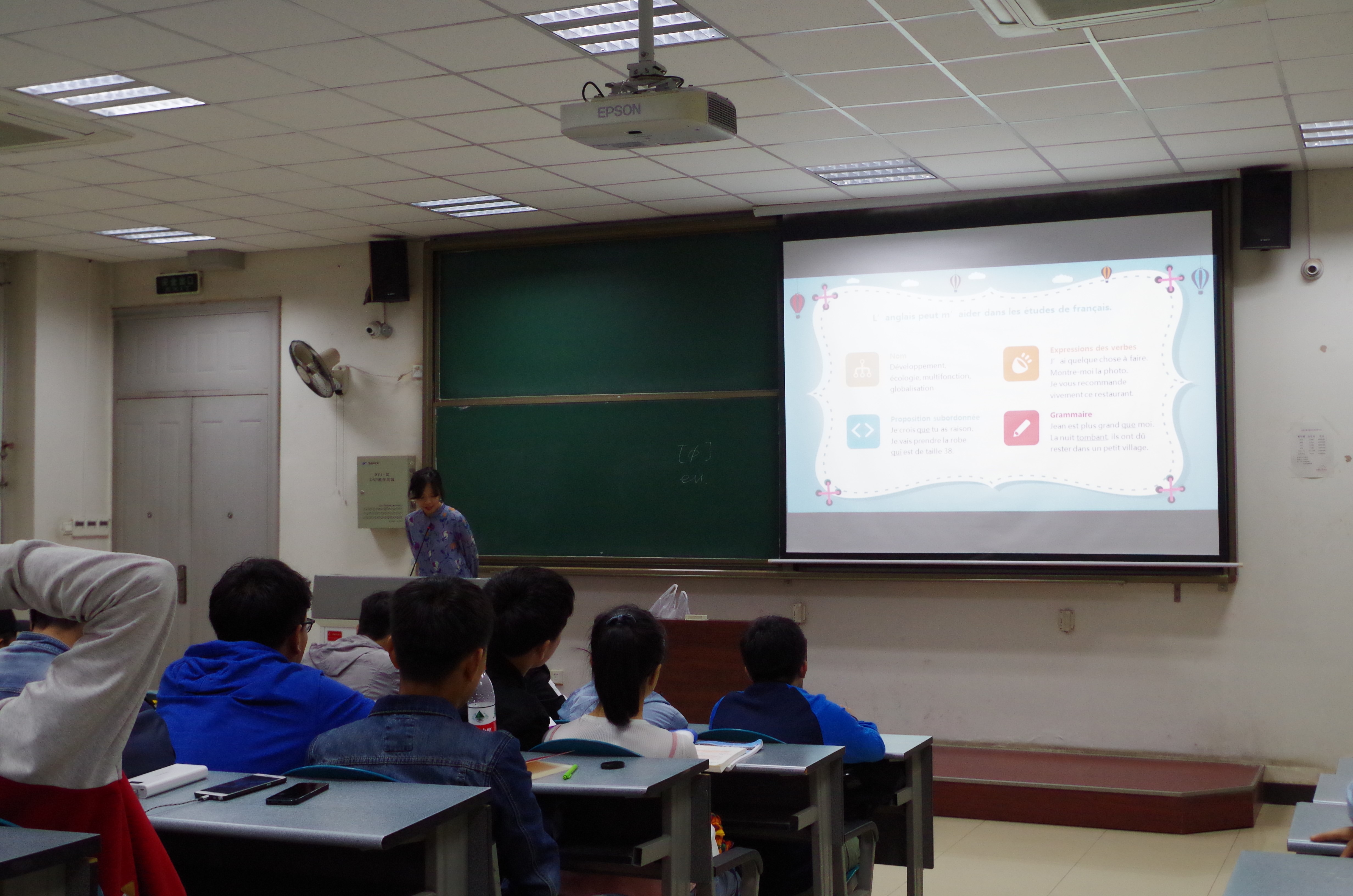 讲座伊始,新东方的汤老师从语音语调语速讲起,为同学们讲解了法语中语音相似的词的不同、不同语境下不同语调的含义以及用错语调会弄出的笑话,幽默的视频以及引人入胜的讲解,吸引了同学们的兴趣,现场时不时爆发出阵阵的笑声。