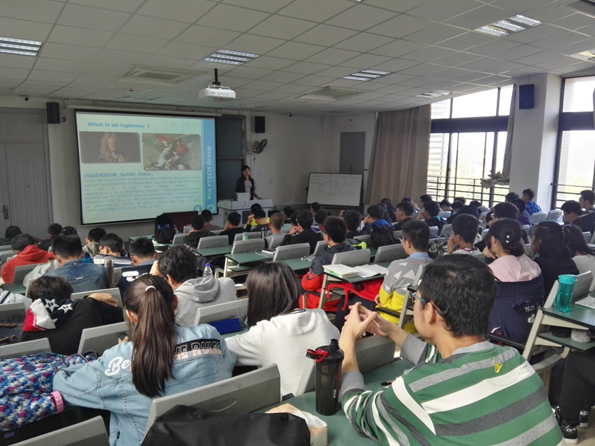 在针对大一新生的讲座上,尹老师从自身学习和工作经历讲起,用生动的语言,与同学们分享在法国的学习和生活,并讲述了法国工程师联盟14所公司的概况及课程安排,特别是针对自身所在的尼斯索菲亚综合理工公司进行了详细的介绍。接着,尹老师还对电子类专业工程师毕业后发展、法国工程师教育理念等进行了具体的讲解。随后,尹娜老师为同学们讲述了法国课堂模式,并用法语与同学们热情互动,鼓励大家努力学习法语,保持对所学专业纯粹的动机,并表示了对大一新生的殷切希望和祝福。