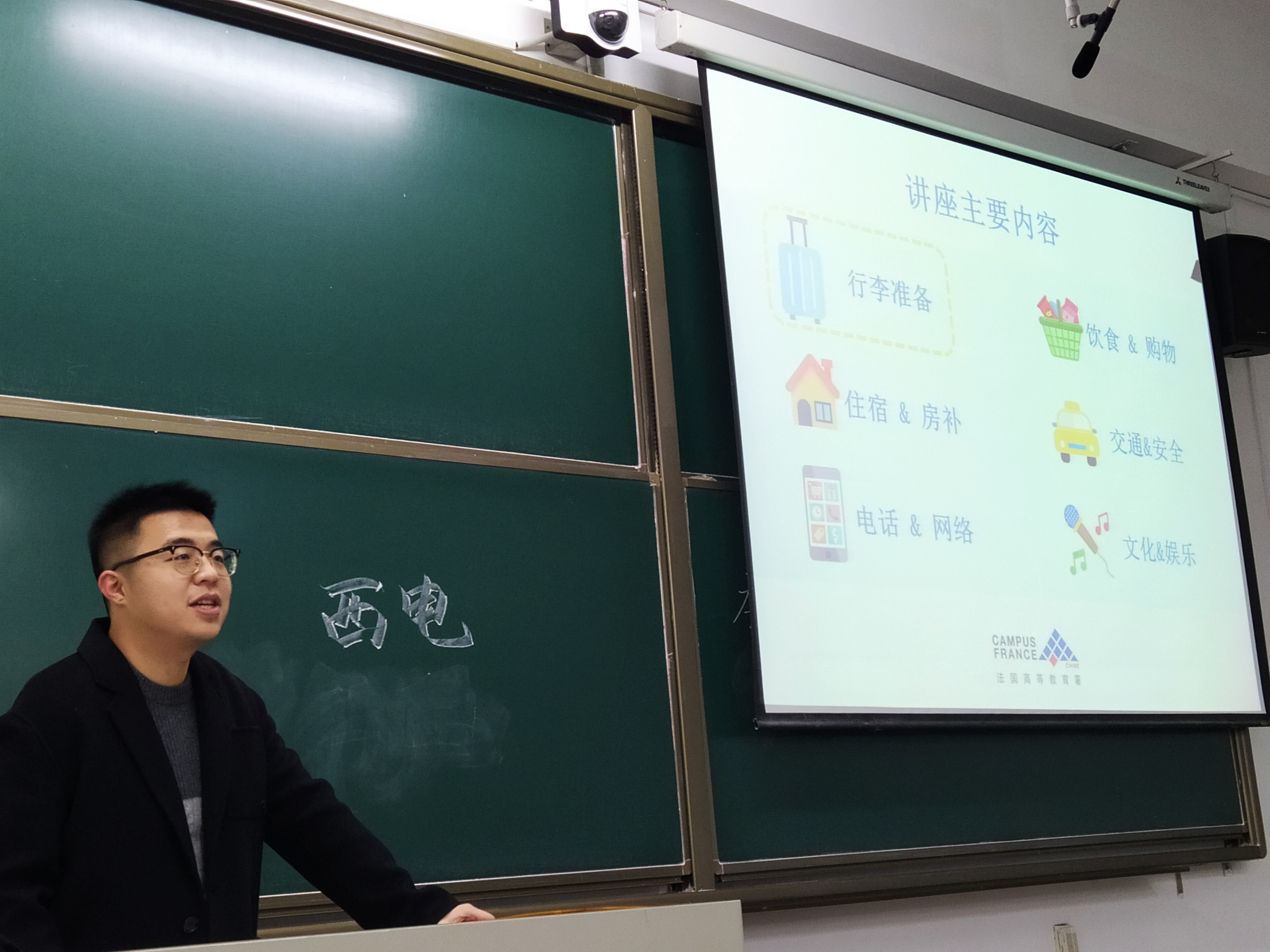 (通讯员 张燕菲 王金龙)12月13日19:00,中法合作办学项目在南校区B楼105教室,开展了“蓄势待‘法’·走近法兰西”系列活动的第四期:西电人在巴黎-生活篇。本次活动邀请了公司2010级通信工程公司通信工程毕业生、现中法文化艺术交流协会中国分部负责人郑森老师作为主讲嘉宾。郑老师根据自己在法国巴黎多年的求学经历,为同学们分享了行前物品准备和法国当地生活。