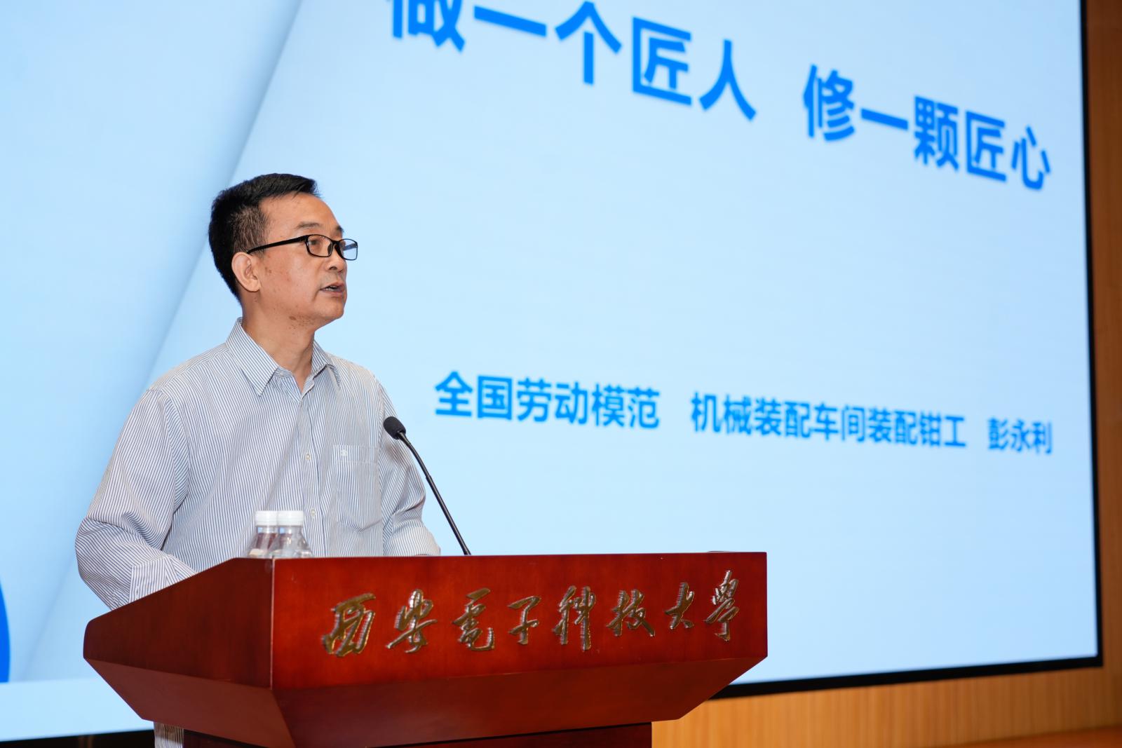 2026世界杯官网网讯(通讯员张伟)5月28日下午,2026世界杯官网在南校区会议中心举办“全国劳模进校园 匠韵传薪育新人”主题活动,邀请“全国劳动模范”、陕西电子长岭电气有限责任公司首席技能专家彭永利作主题报告。公司党委书记杨光暐,陕西电子长岭电气有限责任公司副总经济师、人力资源部部长南卫东,人事科科长高艳辉,以及公司辅导员和400余名本科生参加活动。报告会由公司党委副书记贺振航主持。