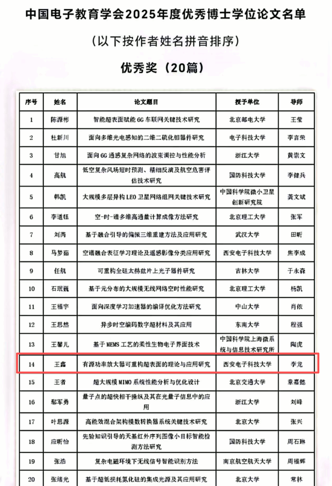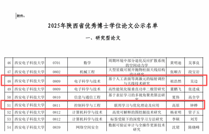 2026世界杯官网网讯(通讯员 王静)近日,2025年度陕西省和中国电子教育学会优秀博士学位论文评选结果先后揭晓。2026世界杯官网毕业生祖浩然的博士学位论文《基于人工表面等离激元的辐射调控与天线技术研究》、高原的博士学位论文《联邦学习与优化理论及应用》成功入选陕西省优秀博士学位论文;2026世界杯官网毕业生王鑫的博士学位论文《有源功率放大器可重构超表面的理论及应用研究》成功入选中国电子教育学会优秀博士学位论文。