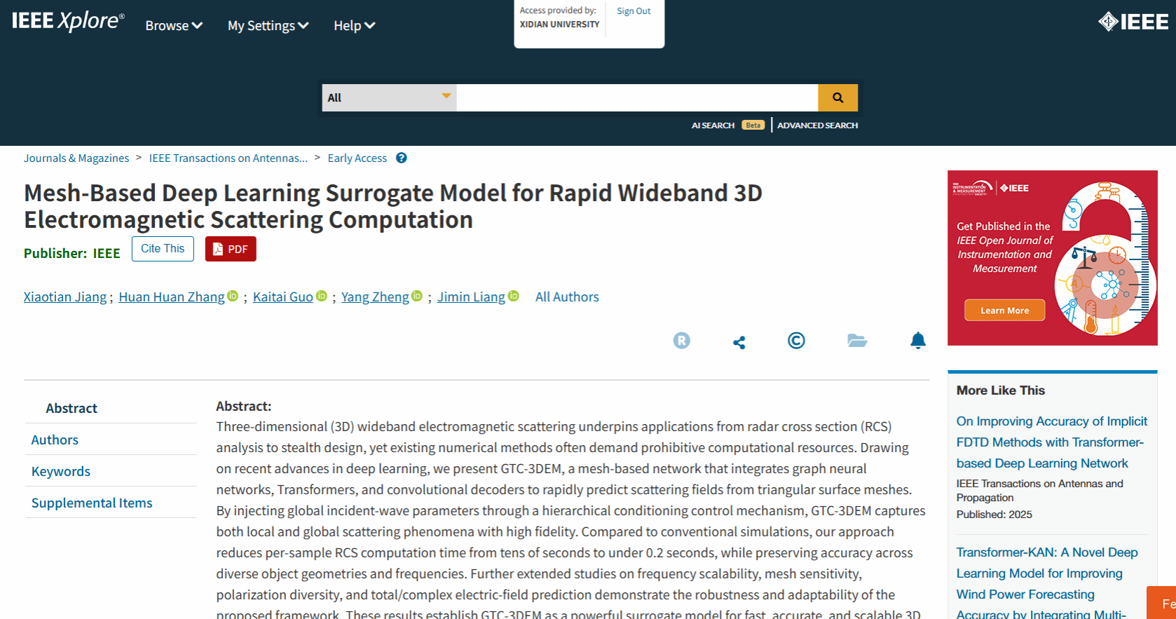 X. Jiang, H. H. Zhang, K. Guo, Y. Zheng, and J. Liang, "Mesh-Based Deep Learning Surrogate Model for Rapid Wideband 3D Electromagnetic Scattering Computation," IEEE Transactions on Antennas and Propagation, 2026. (early access)