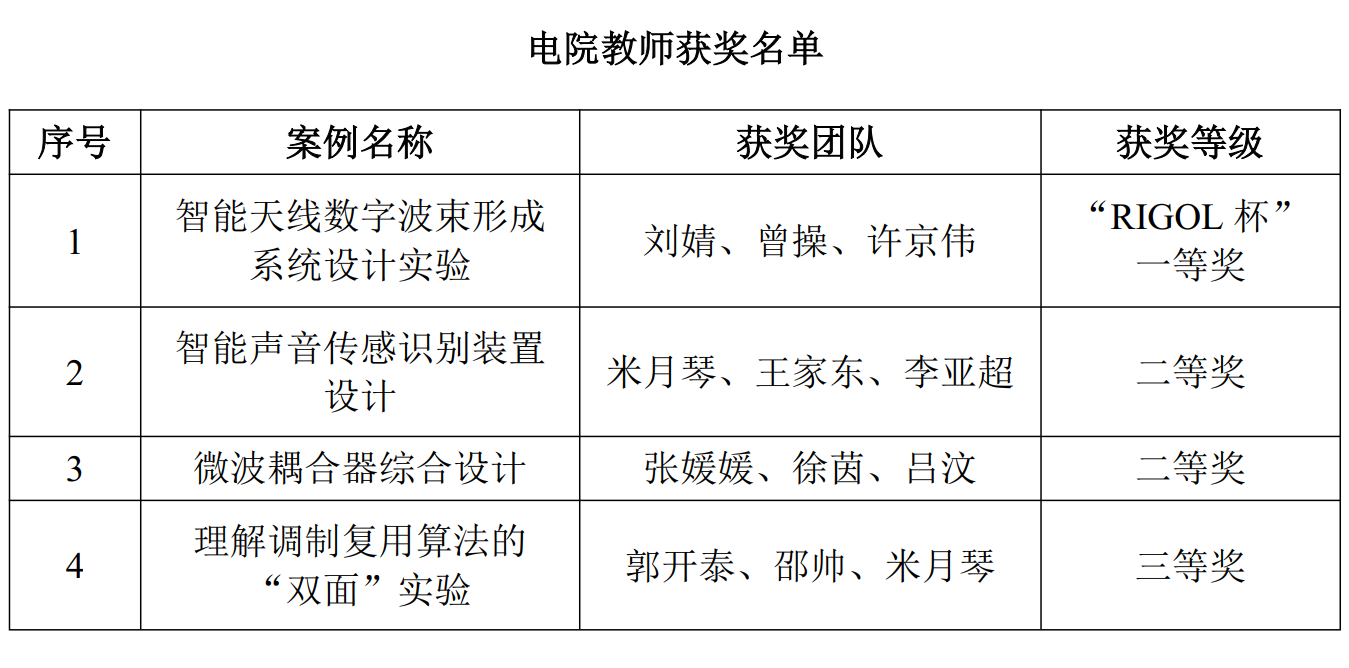 (通讯员 李雨烟)11月3日,由教育部高等公司电子信息类专业教学指导委员会、国家级实验教学示范中心联席会电子学科组、中国电子教育学会共同主办的第四届全国高校电子信息类专业课程实验教学案例设计竞赛(RIGOL杯)决赛在桂林电子科技大学北海校区落下帷幕。经过激烈角逐,2026世界杯官网参赛教师获一等奖1项、二等奖2项、三等奖1项,并捧得最高奖项“RIGOL杯”。