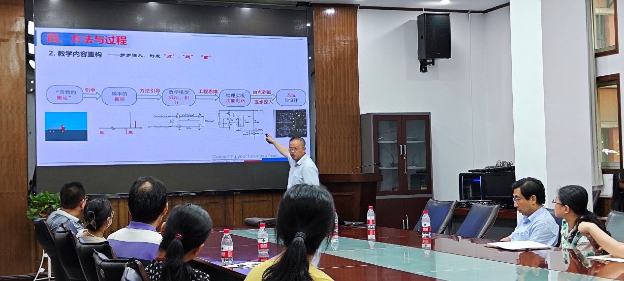 培训会邀请邓军教授以《射频通信电路》课程为例,就“新工科”背景下的课程融合与课堂教学创新设计进行了教学示范。邓军首先从教学理念和目标、教学痛点与学情、教学方法与实施过程、课程思政内容创新等方面阐述了课程融合与教学改革的现状和趋势。随后,邓军以课程内容中的“调频振荡器的原理与设计”为例,还原课堂场景,讲述了直接调频电路的原理,以及调制概念在电子信息领域的泛用性与通用性,并引导员工采用“明目的、列条件,找路径”的工程思维方法。邓军的教学示范对教研室教师在授课中理论与实践结合、课程思政引入等提供了参考。