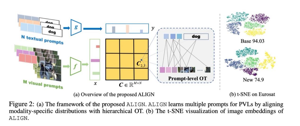 王东升的论文《Tuning Multi-mode Token-level Prompt Alignment across Modalities》探索形成了一种用于多模态提示学习的新范式,并提出一种新颖的token级别的模态对齐方法。文章将图像及其标签建模为隐空间的离散分布,同时考虑层次化的表示学习,通过引入全局和局部最优传输理论实现图像-文本模态对齐,然后可视化展示学到的转移矩阵,文章直观地展示了模型学习的对齐关系。大量实验结果证明所提方法在多种任务场景下达到了sota结果。
