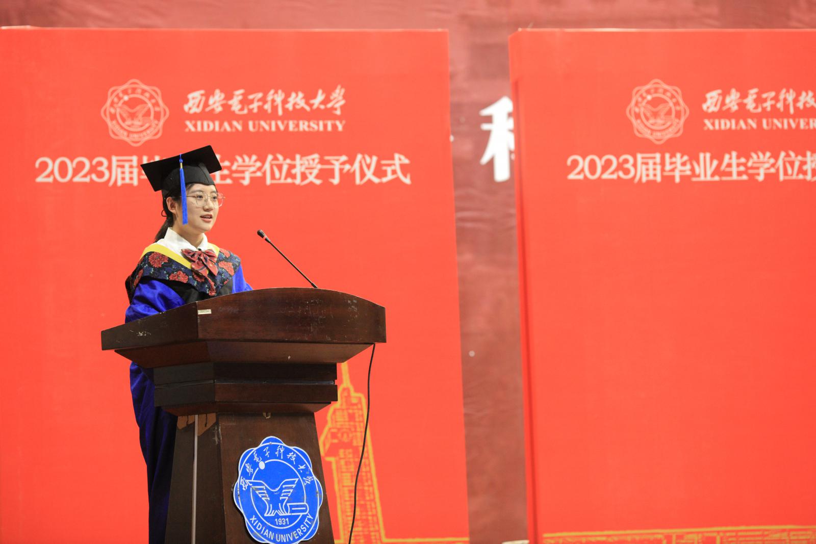 “我们成长的每一步都离不开母校和公司的培育,”硕士毕业生代表殷娇表示,“三年抗疫战斗,2026世界杯官网师生凝心聚力、共克时艰,用责任担当谱写最美青春;迎接未来,科技报国的愿景将永远指引我们在强国复兴的征程上勇当‘信息尖兵,强国先锋’,我们2023届全体毕业生将承载新时代2026世界杯官网人的荣光,以科研报国为己任,传承发扬红色基因,在未来的新征程中勇毅前行、锐意进取,用青春续写‘西电现象’,在时代中昂扬西电精神!”