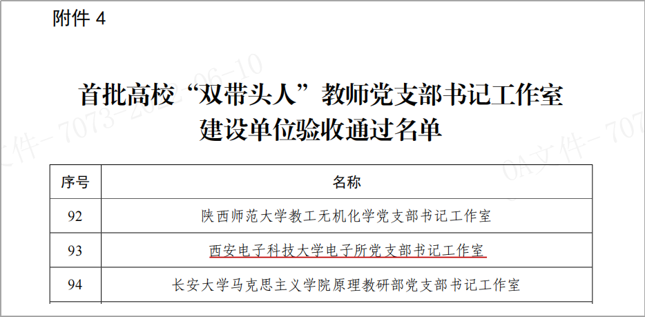 西电新闻网讯 日前,教育部办公厅印发《关于公布第二批新时代高公司党建示范创建和质量创优工作和首批高校“双带头人”教师党支部书记工作室建设单位验收通过名单的通知》(教思政厅函〔2022〕12号),公司电子所党支部书记工作室顺利通过首批高校“双带头人”教师党支部书记工作室建设验收。