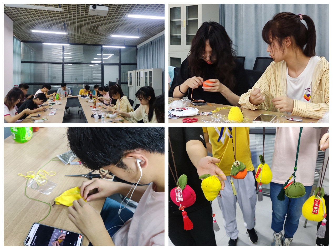 端午节除了吃粽子、赛龙舟,佩戴香囊也是一个传承了上千年的习俗。“端午香囊DIY”活动现场,艾草、布料、针线、配件等材料一应俱全,指导老师首先向同学们普及了端午节的起源、习俗以及香囊的制作方法,同学们一边穿针引线制作香囊,一边相互讨论着缝制要点,现场气氛融洽活跃。除了女同学外,活动也吸引了一批第一次接触针线的男同学,他们拿着绣花针丝毫不马虎,用生涩的手法穿针、系结、填棉花、装艾草,一针一线虽不熟练、但很认真。在淡淡的艾草清香中,一个个小巧玲珑、沁人心脾的香囊诞生了。男同学们不禁感慨:“做香囊太难了,细心、耐心一样都不能少,能坚持缝制完成,是很大的挑战!”看到自己辛苦的劳动成果后,同学们纷纷拿出手机拍照,分享给远方的家人们。香囊缝制活动不仅为端午佳节营造了浓厚的氛围,更传承和弘扬了香囊制作这一传统习俗。
