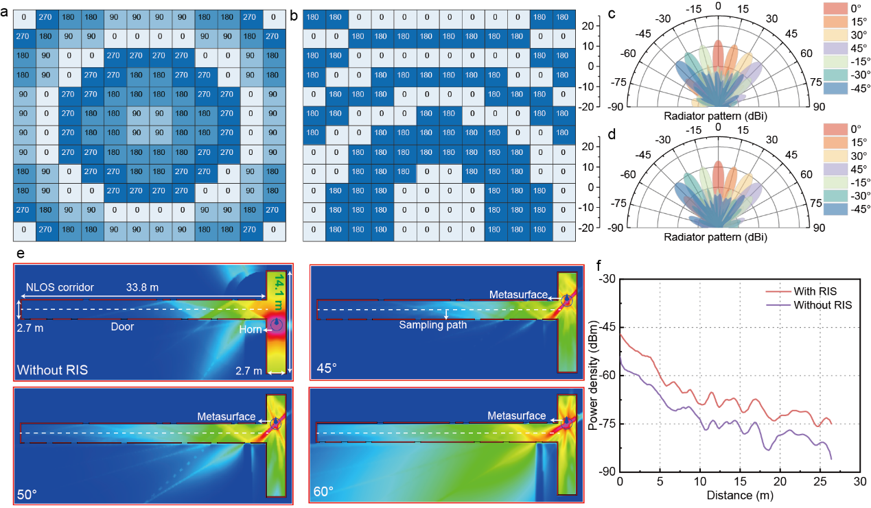 图3可重构智能超表面散射模式特性:(a)散射模式初始相位,(b)30°散射波束扫描编码,(c)E和(d)H面散射波束扫描特性,(e) L形走廊中的功率密度分布,(f)L形走廊盲区覆盖特性