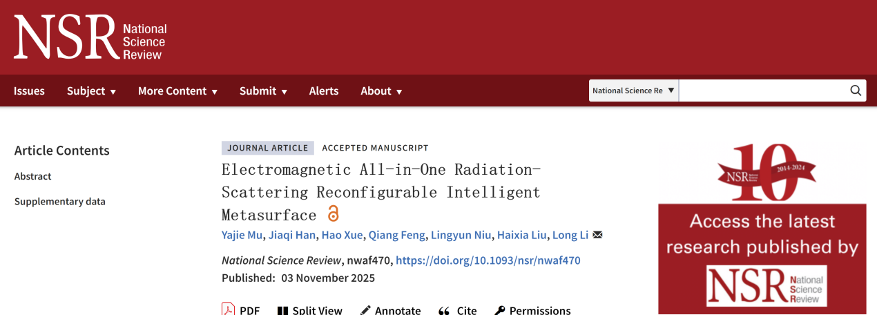 Y. Mu, J. Han, H. Xue, Q. Feng, L. Niu, H. Liu, and L. Li, Electromagnetic All-in-One Radiation-Scattering Reconfigurable Intelligent Metasurface,National Science Review, nwaf470, 03 November 2025.