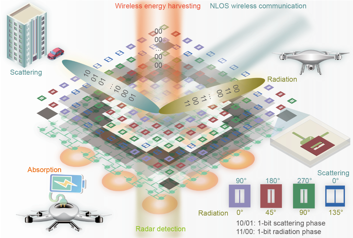 电磁多维融合幅散可重构智能超表面揭示了电磁空间能量与信息协同调控新途径。通过统一物理平台实现通信-感知-决策-供能的深度融合,这种一体化架构在追求性能平衡的同时,能显著降低硬件成本与系统功耗。这一突破实现了能量与信息同传的新型电子信息系统,为6G通信、智能无人机续航和无线传感网万物智联时代提供全新的技术范式。该研究得到了国家自然科学基金委信息超材料卓越研究群体项目、国家重点研发计划等项目的支持。