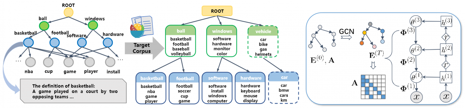王东升与徐逸石合作的《Knowledge-Aware Bayesian Deep Topic Model》提出了一种在概率建模过程中引入先验领域知识的新方法,可以帮助模型学习到更加符合人类认知的层次化概念表示。与完全基于数据似然的方法不同,本文所提出的模型通过将单词和主题嵌入到同一向量空间中从而实现对文档和先验知识的联合建模。基于图卷积神经网络的编码器使得语义相似的主题和单词之间可以进行信息交换。此外,借助先进的自适应图技术,本文还提出了一个模型的扩展版本,该扩展旨在引导模型对所提供的先验主题结构进行完善以匹配目标语料库。模型的主要思想如下图所示。