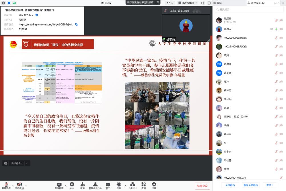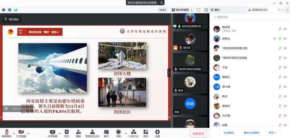 赵思垚同学首先介绍了本轮疫情的重要程度,鼓励同学们要有“红军过草地一样的精神去面对困难、面对疫情”,之后简要介绍了西安此次疫情中市委市政府包括每一位市民做出的努力,并且从一名抗疫志愿者的角度,号召同学们团结一致,一起为抗击疫情贡献自己的青春力量。