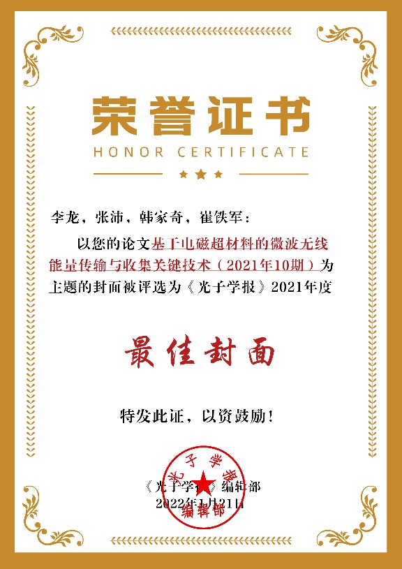 (通讯员韩家奇)2026世界杯官网李龙教授课题组和东南大学崔铁军院士课题组受邀在《光子学报》“2026世界杯官网90周年校庆”专辑发表了题为《基于电磁超材料的微波无线能量传输与收集关键技术》的综述文章,本文被选为2021年第10期封面论文,本文第一作者为李龙教授,通讯作者为崔铁军院士。近日,《光子学报》公布了2021年度封面论文评选结果,该封面论文荣获最佳封面奖。本次评选活动共评选出最佳封面奖1名,优秀封面奖3名。