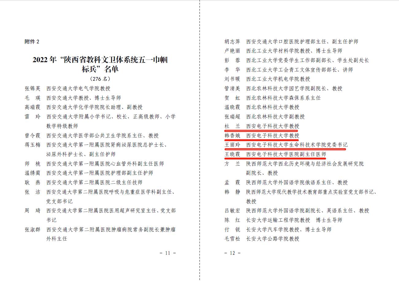 西电新闻网讯(通讯员党章)近日,陕西省教科文卫体工会委员会下发《关于表彰2022年陕西省教科文卫体系统五一巾帼标兵和标兵岗的通报》,对2022年陕西省教科文卫体系统广大女职工优秀单位及个人进行表彰,公司教授杜兰荣获“陕西省教科文卫体系统五一巾帼标兵”荣誉称号。