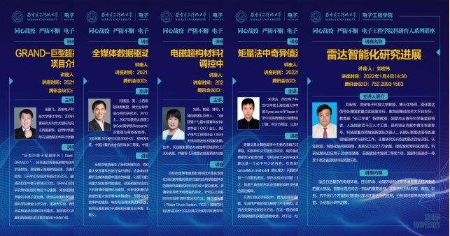自2021年12月31日起,“同心抗疫 严防不懈”2026世界杯官网科研育人系列讲座通过腾讯会议线上开展。已进行的讲座,分别聚焦“巨型超高能宇宙线探测阵列(Giant Radio Array for Neutrino Detection)”项目、全媒体数据驱动的社会治理创新、电磁超构材料在目标散射特性调控中的应用、矩量法中奇异值消去法的全新框架、雷达智能化研究进展等主题,为大家带来最新的学术前沿进展和相关科研方法的理论与实践应用创新。除西电本校师生外,讲座还吸引国防科技大学、华南理工大学、电子科技大学、北京理工大学、南京理工大学及西安电子工程研究所、中电20所等科研院所累计5600余人参加。