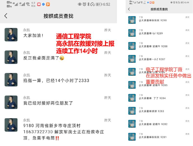 经常工作到凌晨3点、已经连续工作志愿服务5天的罗宏亮同学说:”在参与救灾的志愿者活动中,我们看到了祖国一方有难、八方支援的强大凝聚力,看到了中华儿女不论身处何地都第一时间伸出援手的感人瞬间,看到了高校学子敢于担当、主动作为的青春力量,通过我们的线上志愿服务工作,大批急需救援的河南老乡第一时间获救,我们感到由衷的自豪”。