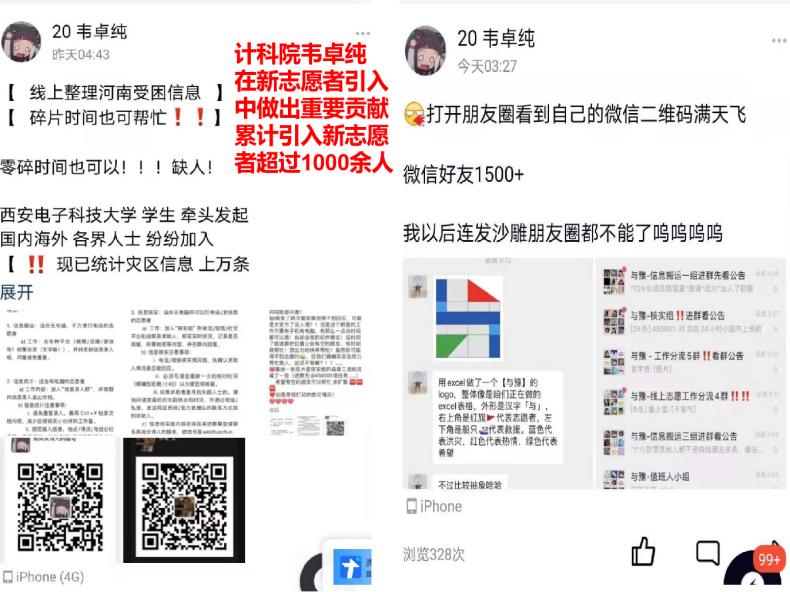 随后,罗宏亮通过QQ空间和微信朋友圈发布倡议,希望更多的西电学子可以加入到河南汛情志愿服务工作中。发出倡议后,参与志愿服务活动的信息迅速在西电学子中扩散。截至7月21日晚,80余位西电学子迅速加入到“与豫”志愿者团队,并且建立起原始信息录入、求助信息电话核实、反馈信息录入、早期求助信息再核实、各类信息上报的闭环流程。志愿者团队采取轮班制,24小时不间断工作,除了凌晨的两三个小时的休息时间,每个环节都有西电学子在工作,当时已经记录核实并上报1400余条求救信息。