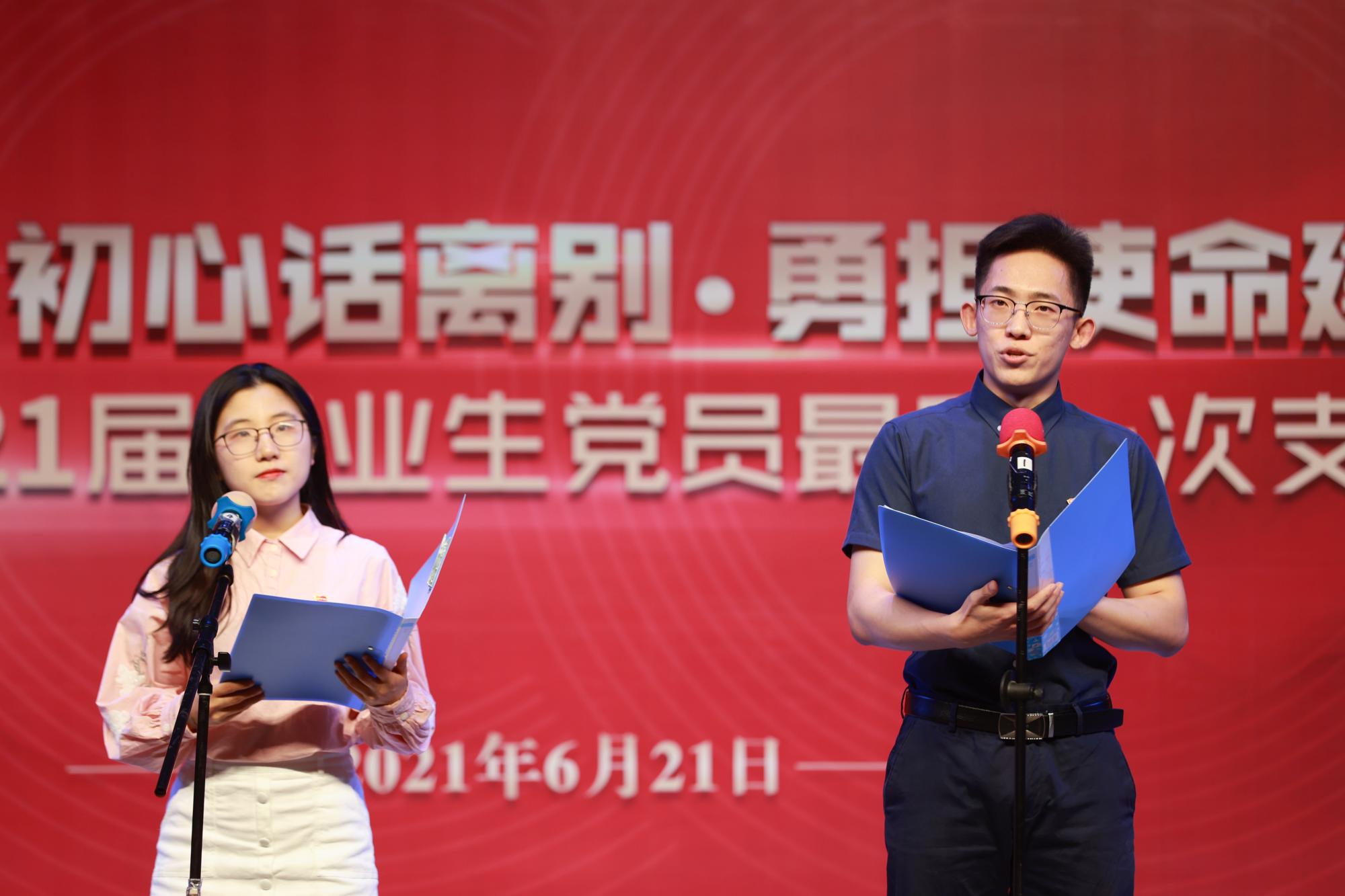 “时间的入口已经被打开,东方这片古老土地上的子孙,已经列队集合在了一起……今天,我们将再次出发,一个创造过奇迹的巨人,必将在世界的注目中再次成为奇迹。他用坚定的意志、勇气和思想,向一个穿越了五千年文明的民族,吹响了前进的号角!”最后一次支部会上,2018级党员代表游霏、王尧天为毕业生党员朗诵《时间的入口》。毕业生党员在校期间发挥模范带头作用,为低年级员工树立了榜样,他们与低年级同学同奋斗、共成长,结下了深厚的同志情谊。