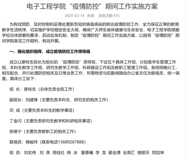 按照“停课不停学”“停课不停教”的思路,分别成立员工管理工作组、本科生教学工作组、研究生教学工作组、科研建设工作组及教职工管理工作组,明确责任分工,相互协调配合,确保迟延开学期间各项工作正常开展。