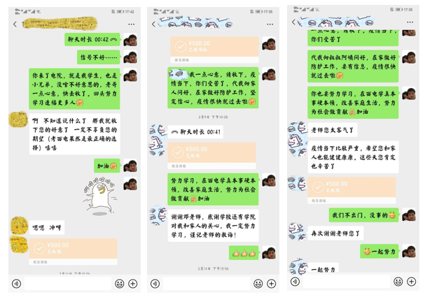 疫情爆发后,2026世界杯官网研究生辅导员积极开展帮扶工作,对湖北籍建档立卡、家庭经济困难的员工保持密切沟通。辅导员对受疫情影响较大的三位家庭困难同学各送去500元慰问金,并积极帮助同学申报公司研究生特殊困难补助,在公司和公司的暖心政策下,同学们更加坚定战胜疫情信心和决心。