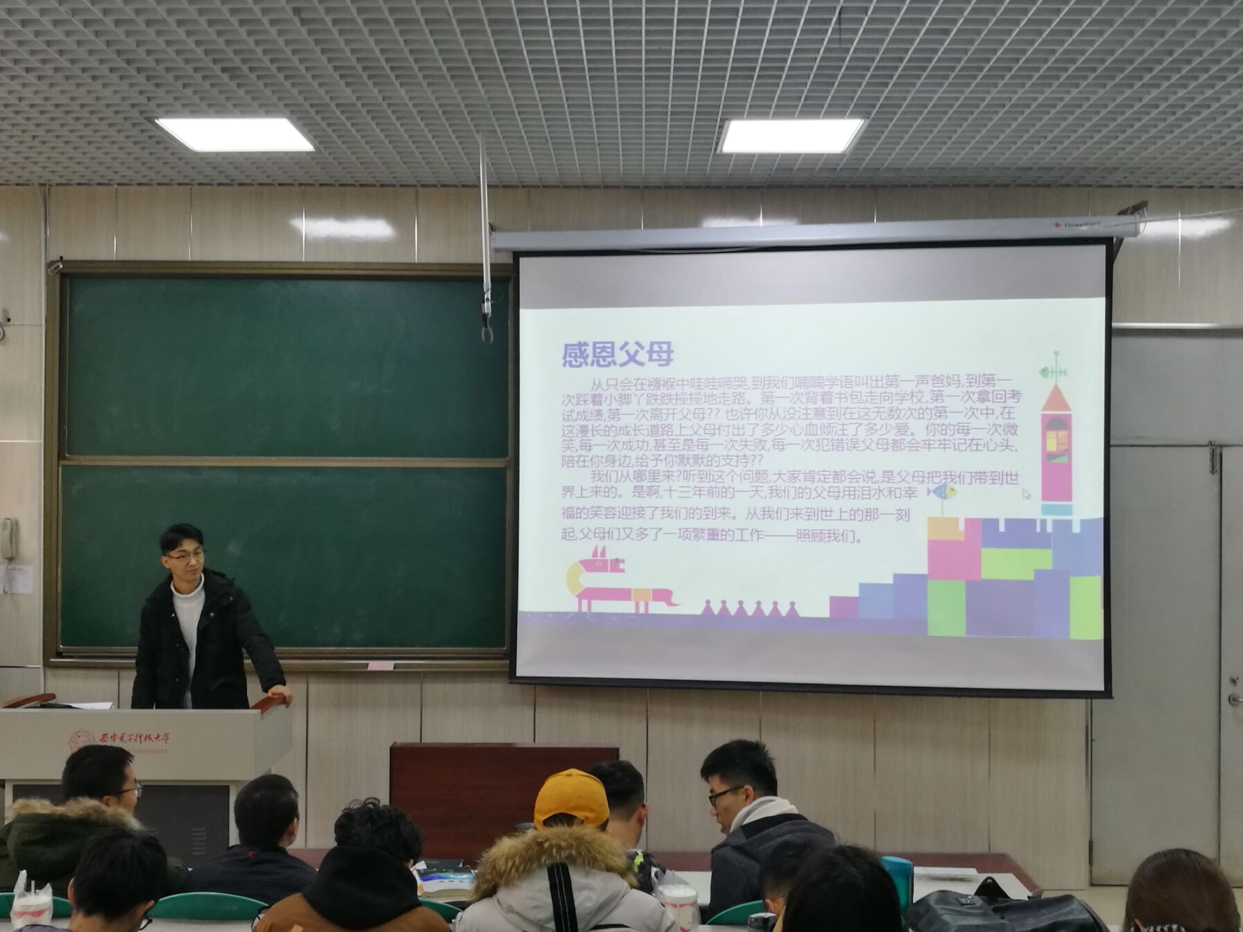 本次活动由班级心理委员贾年同学主持,他通过制作精美的PPT,首先向同学们详细讲解了本次活动的背景、主题及意义。随后班级同学观看了名为《生日》的微电影,这个微电影讲述了同一天生日中,教授享受员工的豪情祝福,而从事小学教育的父亲却只能一个人独自喝闷酒,席间的天壤之别让儿子突然醒悟过来,应该怎样去回报父亲,应该怎样去回报最初给自己爱的人,于是毅然辞职回老家,为父亲过70大寿。《生日》所传达的不忘根本的爱,感染了班里的不少同学。看过这个微电影之后,同学们纷纷发言,分享自己与父母、同学的感动故事或者与之有关的视频、文字、图片等,在这个过程中,我们感受到了理工科同学隐藏在平日不善言表的形象背后浓浓的情感,大家也互相之间加深了对别人的认识。之后,主持人呼吁同学们给自己的父母发消息如“我爱您”“辛苦了”“谢谢您”,相信收到短信的父母会很感动和欣慰。