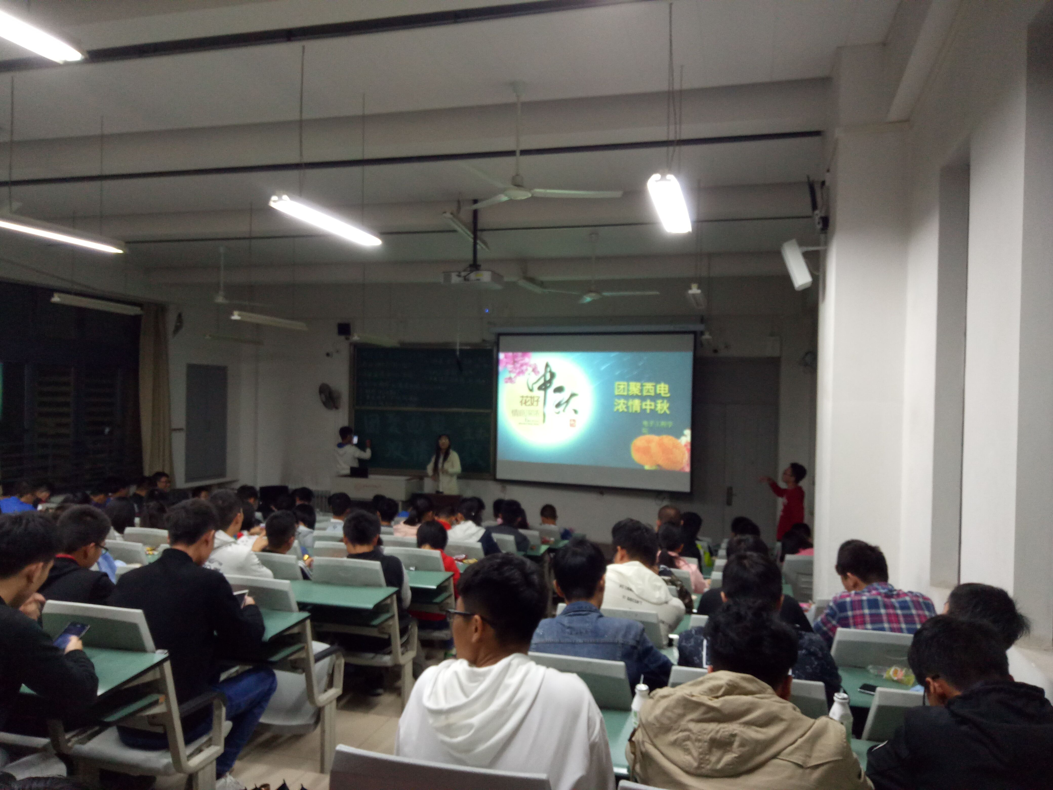 接着,一个幽默的中秋节日视频过度暖场。视频过后是中秋传统文化猜谜语、猜诗词环节,谜语和诗词都与中秋节的传统和习俗相关,这个环节让在座同学充分感悟到中国传统文化的魅力。主持人在黑板上写下了一些谜语,每条谜语都需要一定的传统文化知识储备才能答出。接下来的活动就变成了同学们传统文化和诗词知识储备的决斗场。同学们才情与文思涌动,谜底全部被揭晓,文字迷宫一个个被破解。