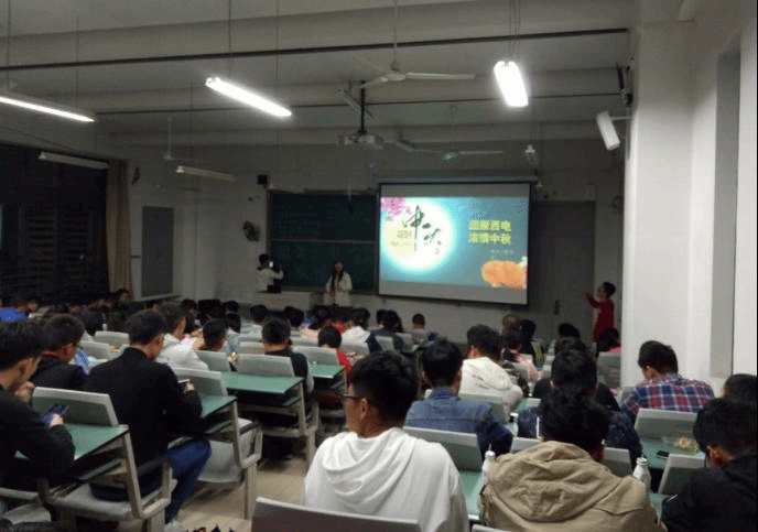 接着,一个幽默的中秋节日视频过度暖场。视频过后是中秋传统文化猜谜语、猜诗词环节,谜语和诗词都与中秋节的传统和习俗相关,这个环节让在座同学充分感悟到中国传统文化的魅力。主持人在黑板上写下了一些谜语,每条谜语都需要一定的传统文化知识储备才能答出。接下来的活动就变成了同学们传统文化和诗词知识储备的决斗场。同学们才情与文思涌动,谜底全部被揭晓,文字迷宫一个个被破解。