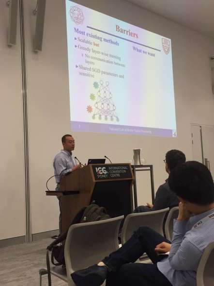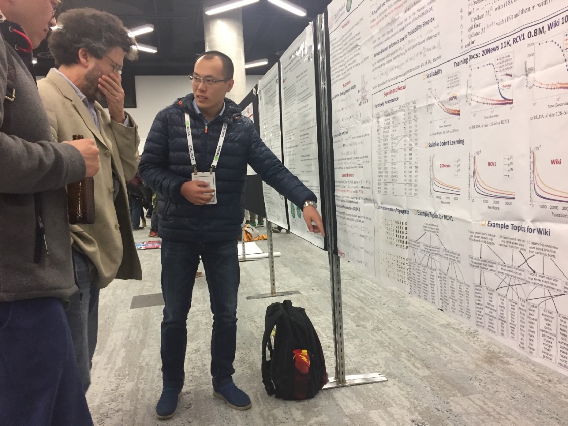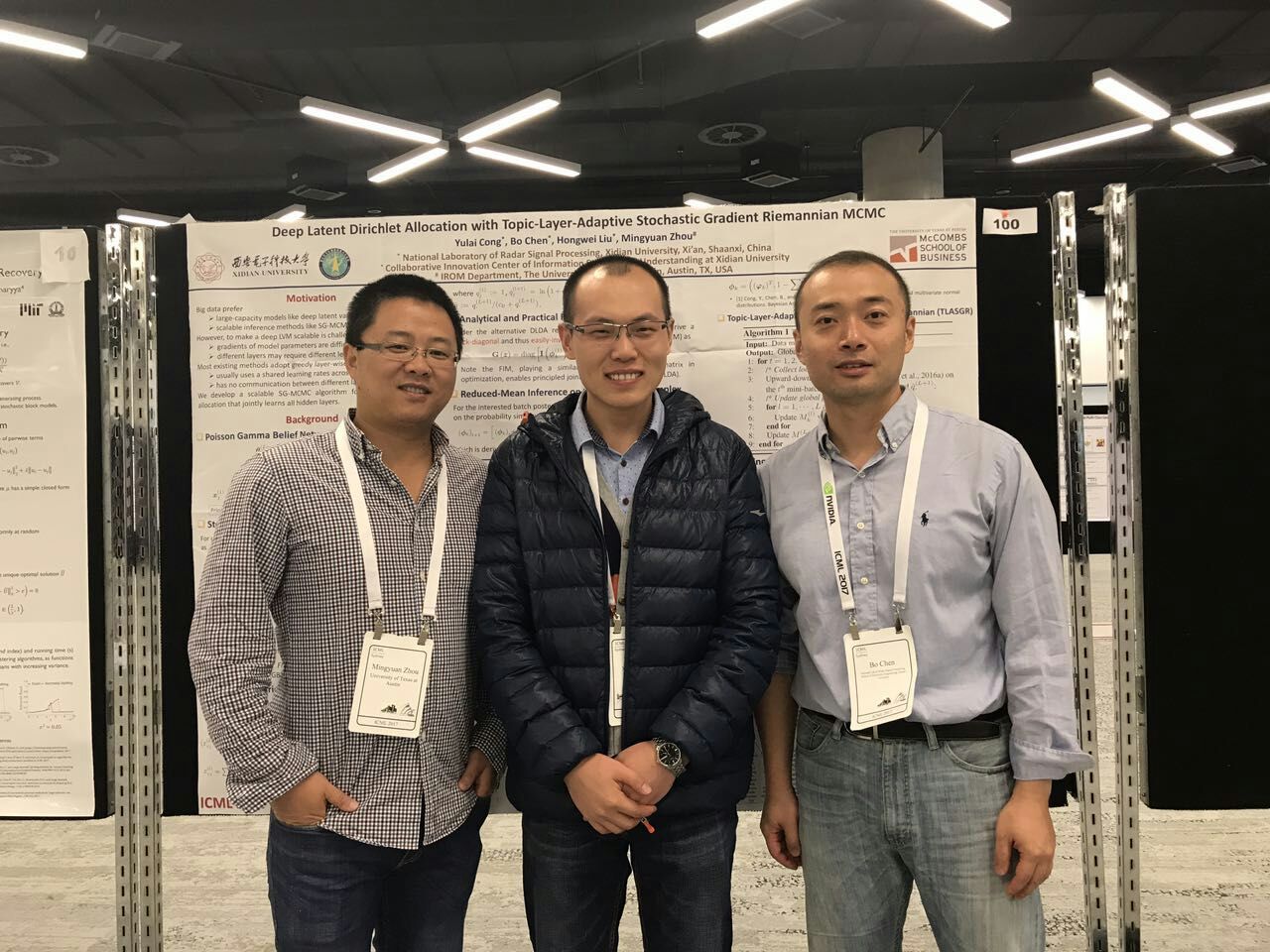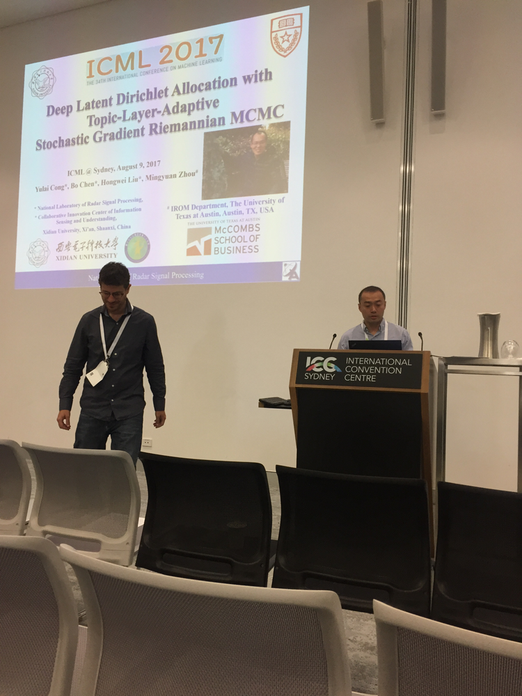 今年,公司雷达信号处理国家重点实验室刘宏伟教授与陈渤教授指导的博士生丛玉来,在有关可处理大规模数据的深度概率模型方面的相关论文,“Deep Latent Dirichlet Allocation with Topic-Layer-Adaptive Stochastic Gradient Riemannian MCMC”,被会议录用,这也是公司首次员工作为第一作者的论文发表在ICML大会上,并做20分钟的口头报告。该工作延续了团队与德州大学奥斯汀分校(UTAustin)周名远教授合作的发表于NIPS2015的深度概率统计模型的相关研究,聚焦大数据下概率统计深层网络的快速学习问题,利用数据增广和边缘化技术,获取概率统计深层网络的Fisher信息矩阵,从而联合随机梯度马尔科夫链蒙特卡洛方法,实现了大数据下对深层网络的高效联合学习,显著提升了概率深度网络的实用性。通过该次大会,一方面展示了雷达信号处理国家重点实验室师生在机器学习领域的研究能力和成果,扩大了实验室的学术影响力,同时也有助于实验室与该领域顶尖学者的交流以及对该领域最新研究进展的了解。
