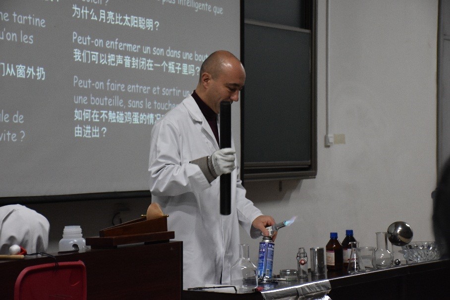 刚进入会场平淡无奇,讲台上陈列着很多化学试剂与器皿,还放着一个大饮用水桶。简短的自我介绍过后,法国Les Atomes Crochus组织资深讲师Richoud Emmance EASTES教授在一片沉默中擦着火柴,黑暗的教室中透着一丝亮光。就在这时,他将火柴放入饮用水桶中,桶中瞬间爆炸,火焰奔腾跳跃,来回窜动,未开灯的会场霎时灯火通明。台下同学们的呐喊打破平静,教授乘机引出今天科学讲座主题——能量。