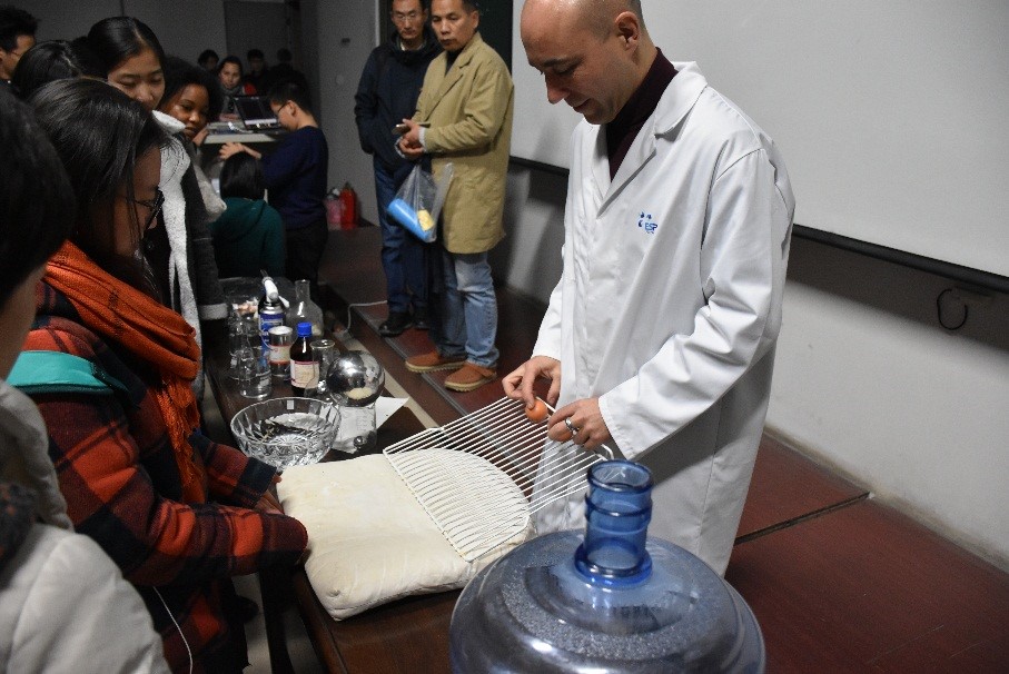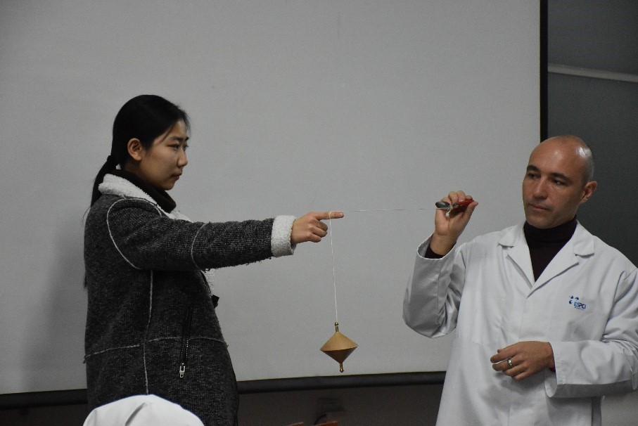 在与同学们互动交流过能量来源,能量载体等问题后,教授列出十大趣味问题,例如能否意念弯勺子,如何悬浮物体等。尽管需用法语交流但同学们依旧积极回答提问,教授通过讲台上的器械挨个用实验探寻真相,并邀请同学们上台互动。看台的同学们也兴趣十足,争相举手猜测解释各种魔幻现象,纷纷称教授为“奇异博士”。经过两小时的探索,同学们结束后仍然恋恋不舍的围住博士共同进行趣味小实验。