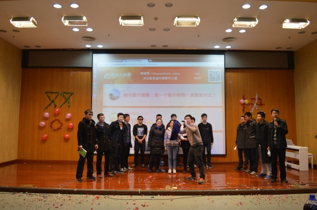 晚上6时许,当《因为爱情》熟悉的旋律响起时,双旦晚会正式拉开了序幕。主持人风趣的语言,让晚会气氛一开始就变得十分热烈。一场场令人捧腹的表演,一个个轰动全场的游戏,使双旦晚会精彩不断。活动部话剧《皇帝选妃》与西电联系紧密,令观众感同身受;科技部魔术《会变的钞票》使人眼花缭乱;外联部的歌曲串烧唤起大家对爱情的向往;宣传部小品《抢劫》的前播视屏展示了他们一点一滴的努力,小品更是十分精彩;外联部《教室里的那些年》又让我们回想起曾经的高三岁月;科技部《白雪公主与三个小矮人》、秘书部舞蹈《逗比的春天》以及策划部压轴大戏《龙门客栈》均令人应接不暇。而中场游戏“背对背拥抱”运气球则是几家欢喜几家愁,赢的部门收到苹果,而输的却要受到小小的惩罚。晚会最终在《难忘今宵》的旋律中落下了帷幕。
