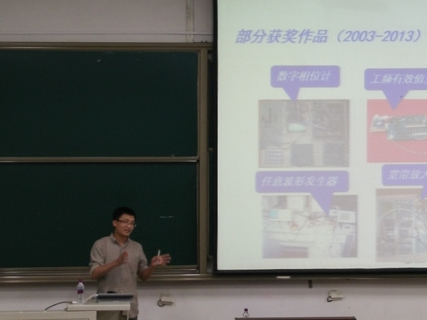 讲座伊始,王新怀老师简单介绍了西电学子近几年来在各类竞赛中获得的优异成绩,并提出了想要出类拔萃何从下手的问题,用简洁明了的展示告诉我们:理论课程是一切的基础。接着,王老师向我们介绍了同学们热切关心的问题,关于理工科电子类校园赛事及竞赛之间的关联性,朴实但又不失幽默的讲说了各类校园赛事的性质和他在带员工参加竞赛的过程中那些感动又励志的故事,更激起了在座的同学对竞赛的渴望。