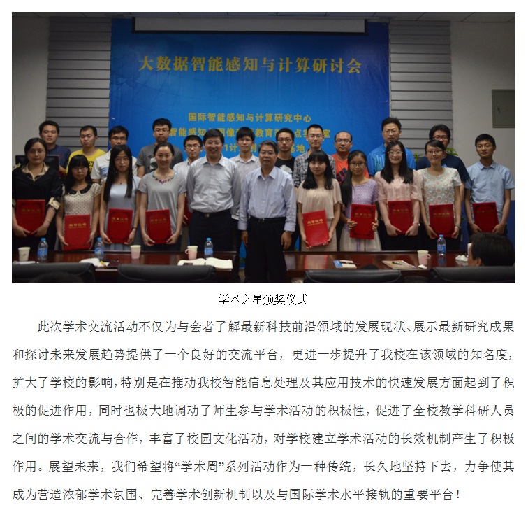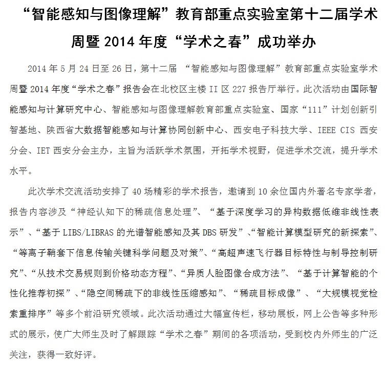 “智能感知与图像理解”教育部重点实验室第十二届学术周成功举办 2014-05-27 11:08:00 浏览次数: 上一篇文章:第四届“智能杯”程序设计竞赛圆满结束 下一篇文章:TCL杯电子组装大赛决赛圆满闭幕