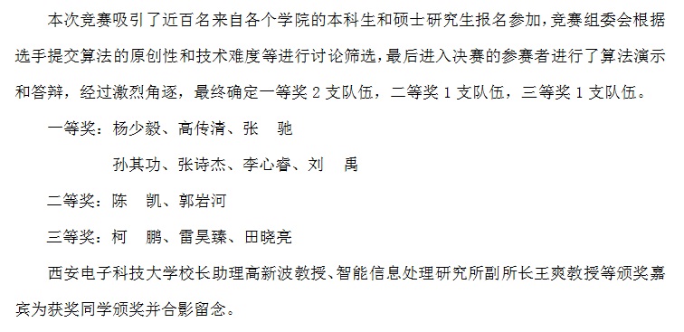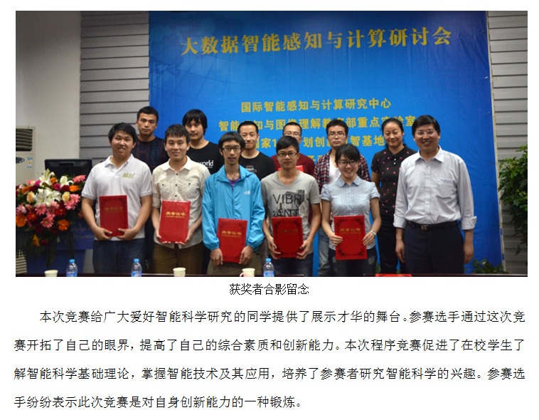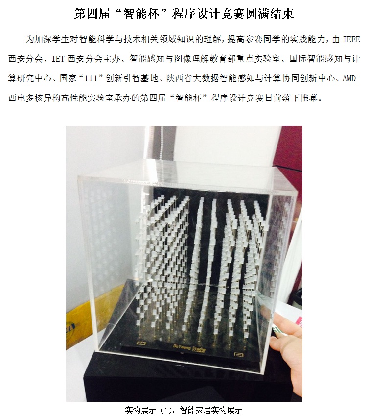 第四届“智能杯”程序设计竞赛圆满结束 2014-05-27 17:46:00 浏览次数: 上一篇文章:9名学子获“AMD-西电多核异构高性能实验室”奖学金 下一篇文章:“智能感知与图像理解”教育部重点实验室第十二届学术周成功举办