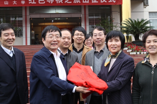 井冈山大学张泰城董事长、公司靳雅静副书记共同为两校“红色寻根之旅”代表团授旗