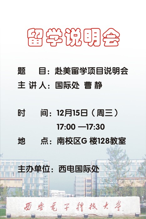 赴美留学项目说明会 2010-12-14 11:55:00 浏览次数: 来源:http://oice.xidian.edu.cn/html/news/notice/2010/1214/1220.html 上一篇文章:公司举办优秀员工经验交流会 下一篇文章:西电2010全国优秀博士学位论文表彰大会召开