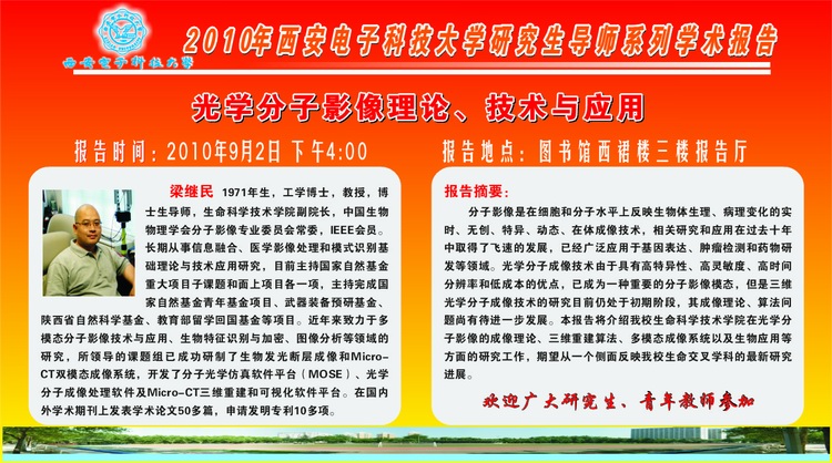 2010年研究生导师系列学术报告预告-生命公司梁继民教授 2010-08-31 17:08:00 浏览次数: 来源 生命公司http://life.xidian.edu.cn/html/news/dtxw/185.html 上一篇文章:新加坡南洋理工大学许智铭博士来公司讲学访问 下一篇文章:2010-2011学年第一学期校历(放假安排)
