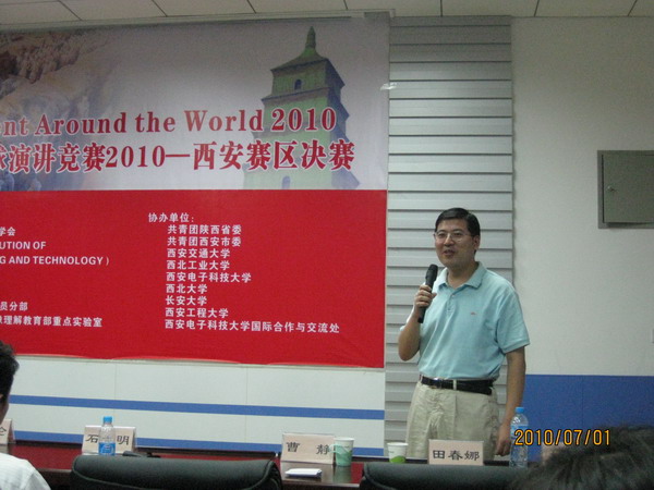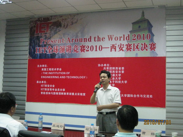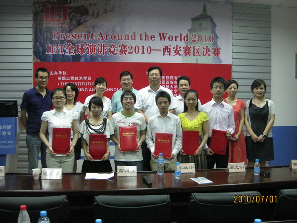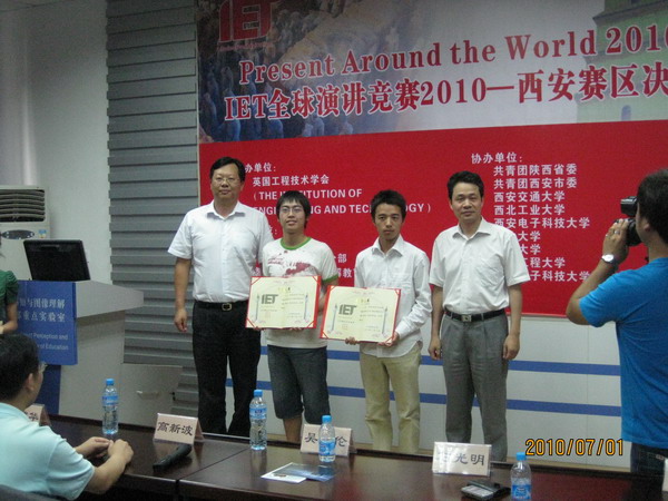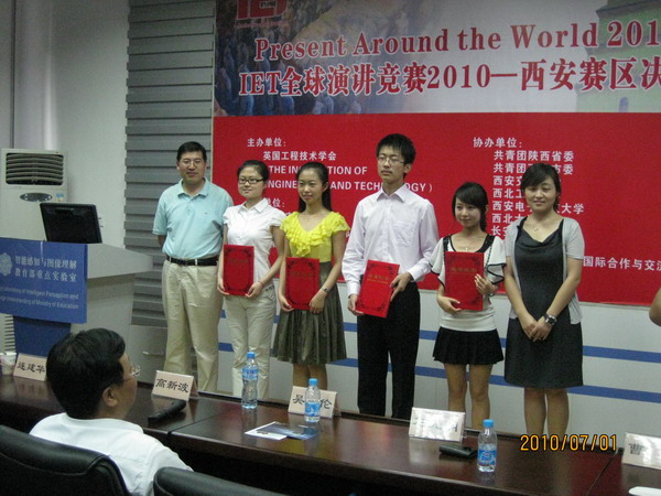 2010年7月1日,IET环球演讲竞赛2010-西安赛区决赛在2026世界杯官网拉开帷幕,来自西安交通大学、西北工业大学、2026世界杯官网、西安工程大学等六名同学凭借初赛中的出色表现进入本次决赛。经过自我介绍、主题演讲、评委提问等环节后,来自西北工业大学的李洪珏和刘鹏脱颖而出,获得本次竞赛的一等奖,来自西安交通大学的高一星和朱怡飞、2026世界杯官网的郑智、西安工程大学的贾天天获得了本次竞赛的二等奖。李洪珏和刘鹏作为西安赛区的冠、亚军将于7月5日赴上海参加IET环球演讲竞赛2010-全国总决赛。