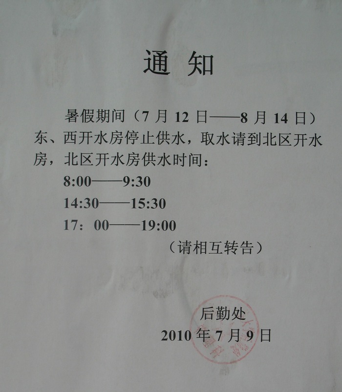 2010假期北区开水供应时间 2010-07-14 10:11:00 浏览次数: 北校区的 “北开水房”在主楼 I区 南测 靠近 行政办公红楼 上一篇文章:2010暑假北校区收发室报箱开放时间 下一篇文章:2010暑假财务处值班安排