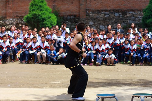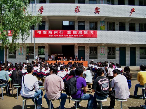 其次是由志愿者和水道河小学的小朋友共同奉献的文艺演出。一首《床前明月光》的歌阙下,优雅的舞袖荡漾出小朋友们朗朗上口的词句和研究生志愿者们的深切回味;一场别开生面的魔术表演让在场的小朋友们眼睛为之一亮,互动表演和精湛的演技更是博得连连叫好;一曲温文尔雅的《我想我是海》吉他弹唱,让时间在志愿者和小朋友亲密相处的瞬间凝固;一道靓丽的民族舞大餐,跃动的音符就如这焕然一新的校舍和师生的精神面貌让人陶醉;一轮小朋友们精彩的舞蹈表演,让这群朝气蓬勃的祖国的花朵感动着在场的志愿者的心灵;一句经典的《让我们荡起双桨》,志愿者和小朋友们共同吟唱,大家仿佛又回到了天真的童年;一段劲道的武术表演,崩张的血脉让观者沸腾让宁静的山区魅力无限;最后的手语表演《感恩的心》,更是道出了水道河师生对奉献爱心参与募捐、关心和支持商州教育事业的各界人士的感激和祝福。