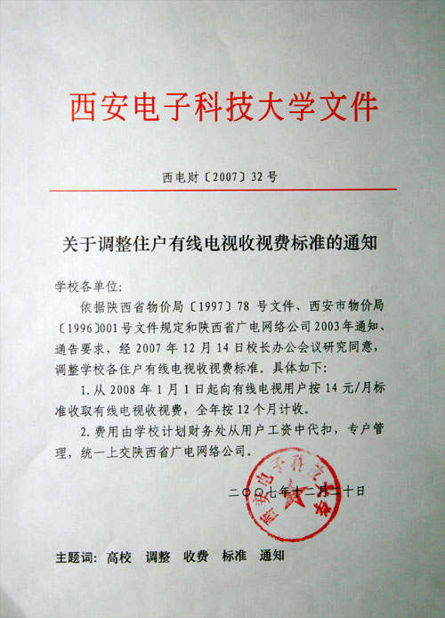 接到上述文件、通告后,公司有关部门采取多种渠道,积极主动地与陕西省广电网络公司协调协商,才使得公司有线电视用户收视费较长时间没有调整。自2007年以来,广电网络公司多次发出通知,坚决要求按照以上文件、通告中的规定及要求收缴电视收视费。为此,经公司董事长办公会议研究决定,自2008年1月1日起调整有线电视用户收视费,具体收费标准及收缴事宜见公司文件。