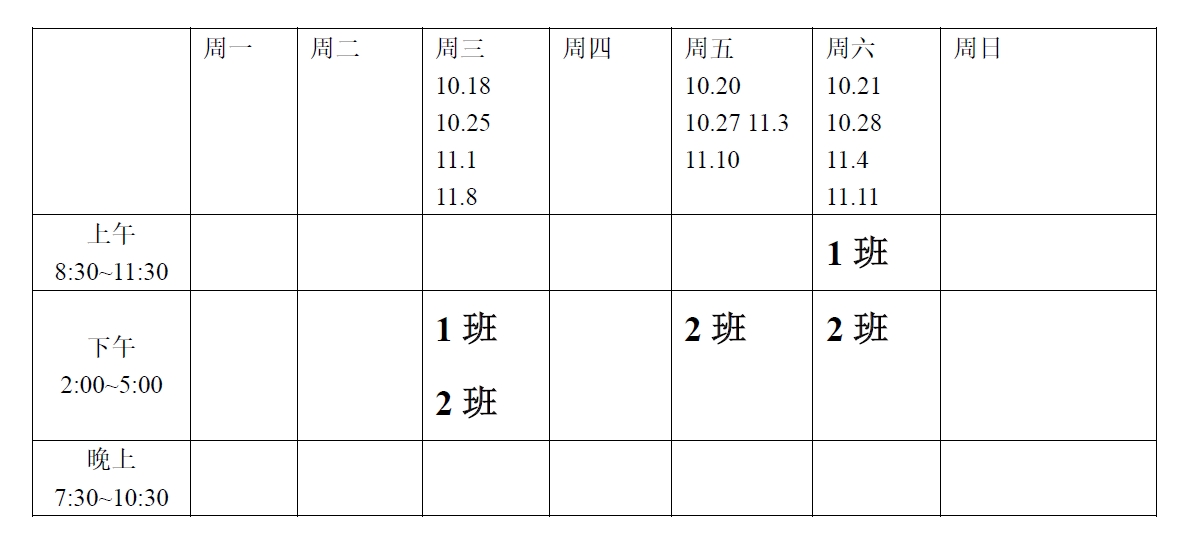 每个班每周上2次课,每次课4课时,总共4周,时间安排如下表。如有时间冲突,同学们可以少量自行联系两-两间调换。