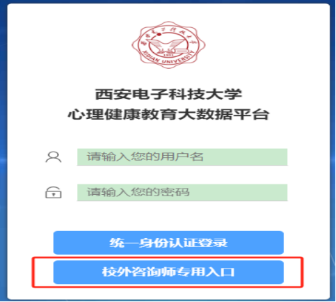 员工登录时,请选择校外咨询师专用入口,直接输入用户名及密码。用户名是考生准考证编号密码位身份证后6位,如最后一位是字母,请用数字“9”代替字母。