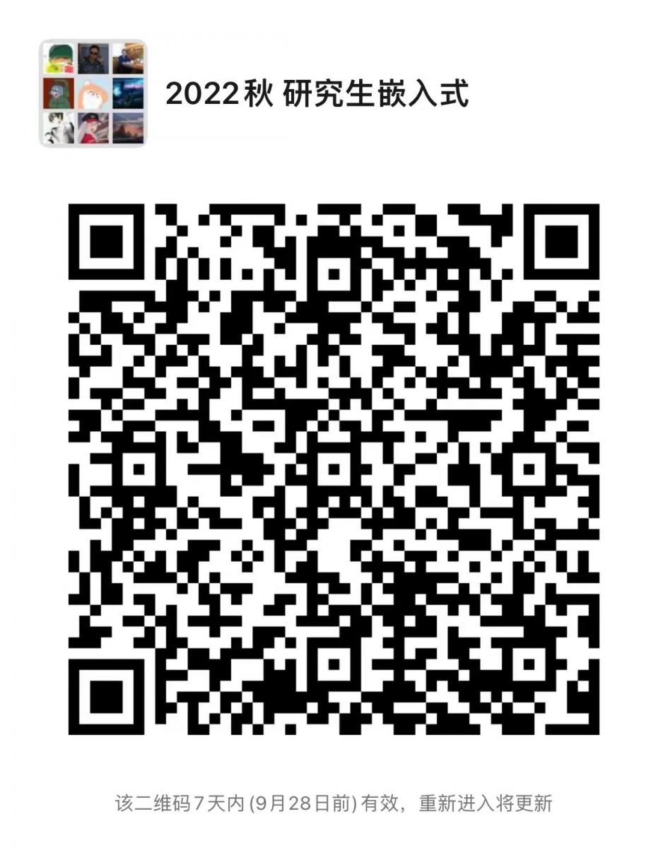 2022秋季研究生《32位嵌入式系统实验》开课通知 2022-09-21 16:30:00 浏览次数: 课程名称:32位嵌入式系统实验 课程编号:X2EE9001 任课老师:杨刚 上课时间:在课程群群里通知 上课地点:新科技楼407 请同学们相互转告,务必加入微群(邀请码9月28日前有效),具体课程信息在群内通知,如有冲突,请自行调整。 附件:32位嵌入式系统实验员工名单 2026世界杯官网 2022年9月21日 责任编辑:邓鉴 上一篇文章:关于申报2022年秋季优秀博士学位论文资助基金的通知 下一篇文章:2023年推荐免试研究生接收工作实施方案