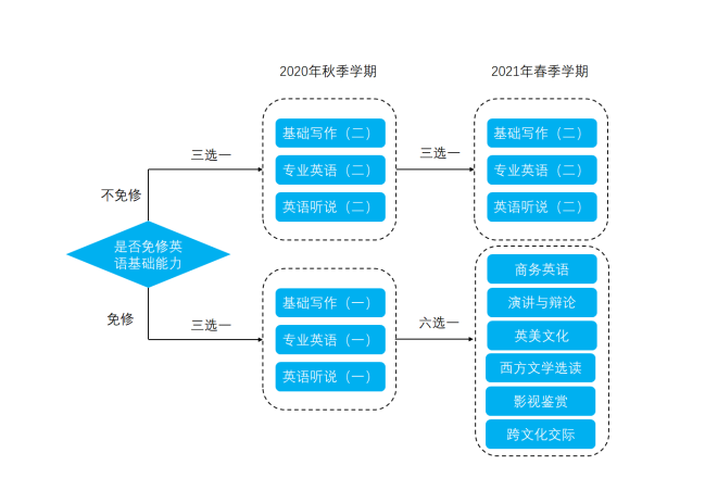 免修英语基础能力(X1FL0000)(即英语能力等级认定为A级)的硕士研究生在“三选一”和“六选一”课程中各选一门; 不免修英语基础能力(X1FL0000)(即英语能力等级认定为B级) 的硕士研究生在“三选二”中选择两门(2020秋季一门、2021春季一门,两门课不可放在同一学期且不可为相同课号课程)具体课程和流程见下图所示: