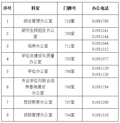 研究生院/研究生工作部关于变更办公地点的通知 2019-01-07 21:58:00 浏览次数: 广大师生、各单位: 研究生院/研究生工作部自2019年1月7日(星期一)搬至南校区行政楼七楼办公,请相互转告。具体办公地点及办公电话如下: 上一篇文章:请提前选研究生课程的2019级推免生登陆系统核对选课情况 下一篇文章:关于2018年度研究生校园地国家助学贷款面签的通知