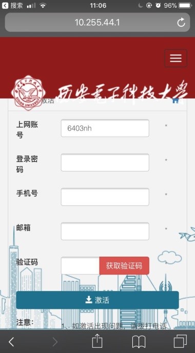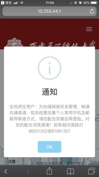 北校区硕士研究生关于无线登录页面激活账号的通知 2017-11-06 16:06:00 浏览次数: 全体硕士研究生: 为加强个人账户安全管理,畅通沟通渠道,现系统需完善个人常用手机号及邮箱等联络方式,请您配合完善后再登陆。激活过程中如有疑问请拨打88201252或88201650 激活方式: 1.笔记本电脑或手机连接stu-wlan,弹出如下图所示页面(如果未自动弹出,请在浏览器输入10.255.44.33) 2.输入用户名密码,点击登录。弹出如下所示页面,按提示操作即可 3.弹出如下界面,说明激活成功,激活成功后重新输入用户名密码即可成功登录。 上一篇文章:关于做好2016~2017学年研究生评优工作的通知 下一篇文章:2017年度天线与微波技术重点实验室学术年会征稿启事