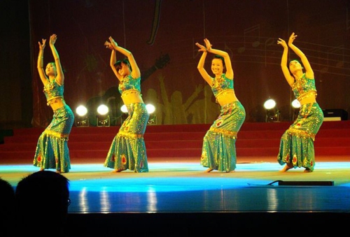 比赛开始,由崔佳等4名女生带来的傣族舞《有一个美丽的地方》第二个出场。柔美的音乐,婀娜的舞姿,让观众们仿佛置身于仙境之中。身穿蓝色服装的傣族姑娘们舞动着生活的美好,感动着在场的每一个人。