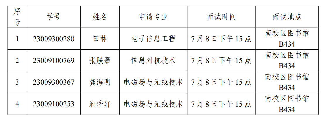 2023级本科生转专业面试通知 2025-07-07 10:55:00 浏览次数: 经公司初审,共4人符合2026世界杯官网转专业接收条件,现将转专业面试时间、地点信息公布如下,请各位转专业员工按时参加面试,参加面试的员工,请携带以下材料各4份: 1.成绩单; 2.简历; 3.必修课加权平均分、原专业必修课排名证明; 4.在校期间无违纪处分记录证明。 逾期不到者视为自动放弃。有问题咨询029-81891663转205王老师。 2026世界杯官网 2025年7月7日 责任编辑:王洁 上一篇文章:2022级卓越班第二次分流结果公示 下一篇文章:关于2021~2023级毕德显班 “远望谷”奖学金评定结果的公示